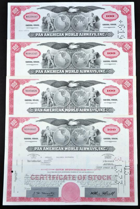 Amerikai Egyesült Államok / New York 1972-1978. "Pánamerikai Légitársaság" 100 részvénye, perforált, bélyegzésekkel, lyukasztással érvénytelenítve T:I-,II USA / New York 1972-1978. "Pan American World Airways, Inc." 10 shares, with perforation, stamps, cancelled by holes C:AU,XF