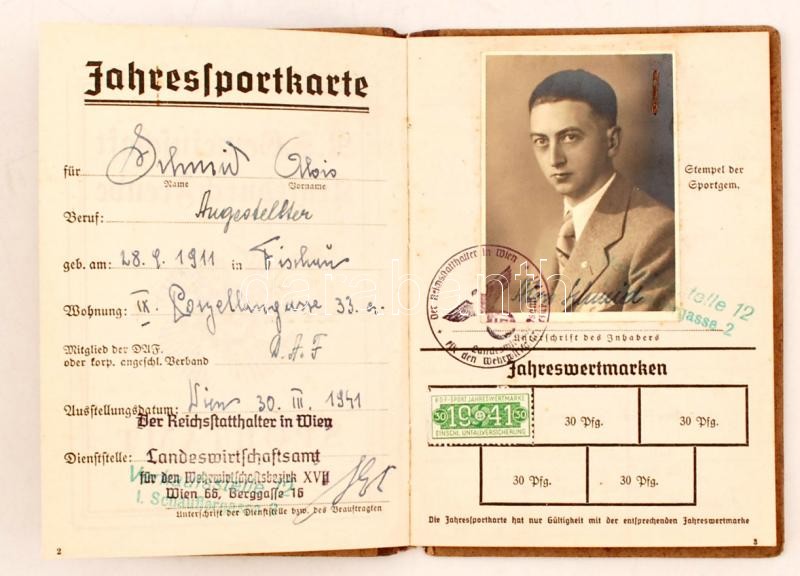 1941 Die Deutsche Arbeitsfront, Jahres Sportkarte, Német birodalmi fényképes útlevél, 15x10cm