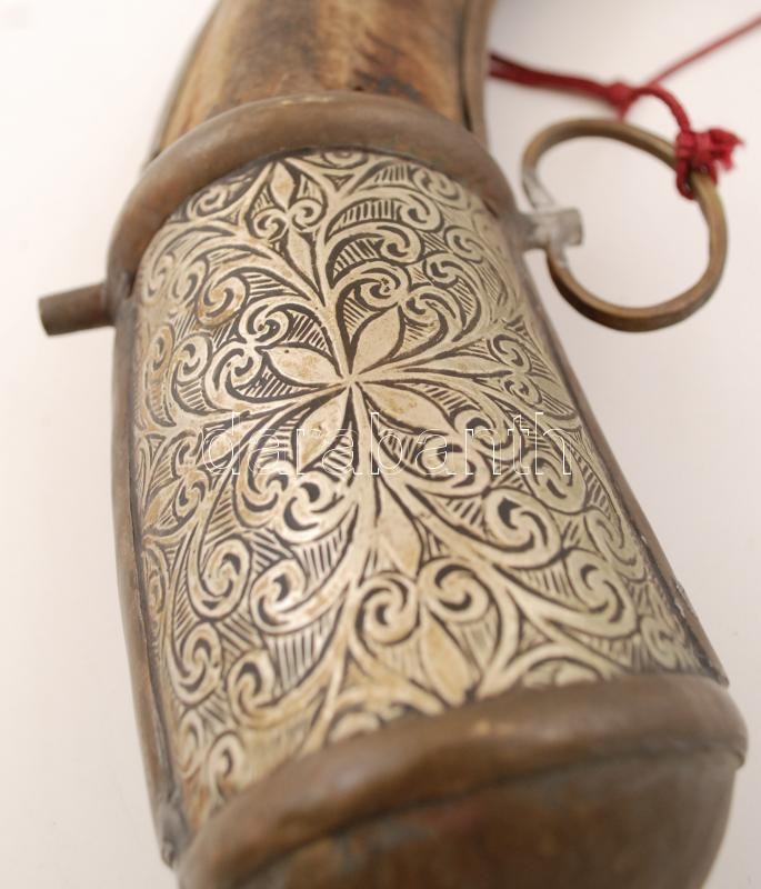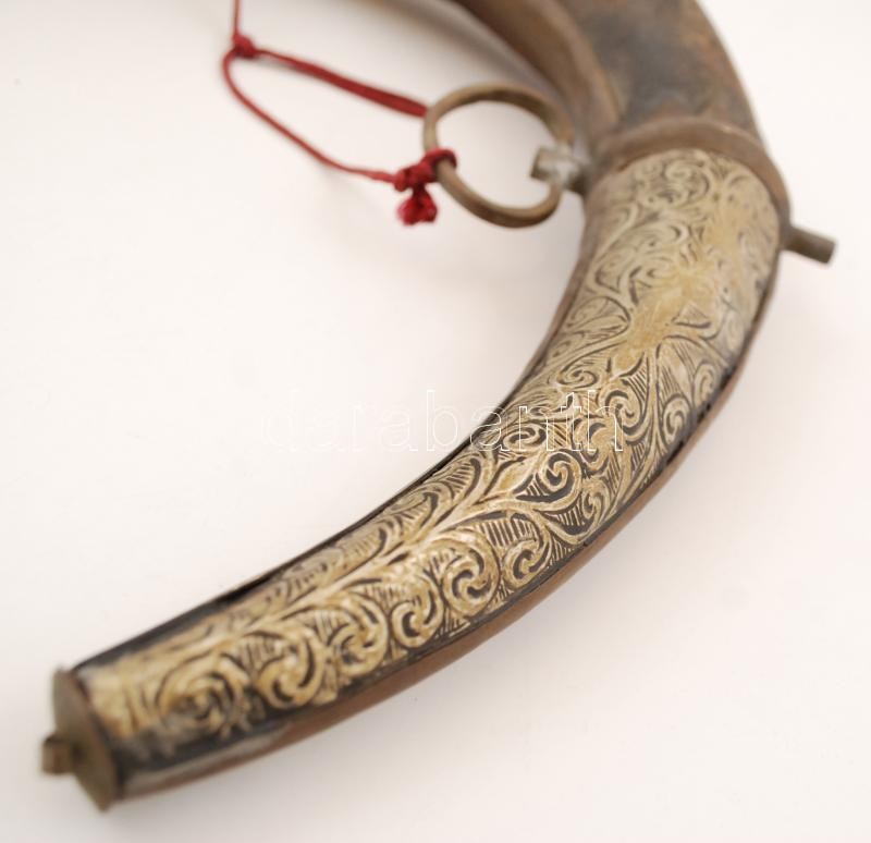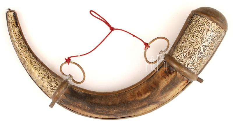 Dekoratív fa díszkürt, díszes réz rátétekkel, h: 40,5 cm