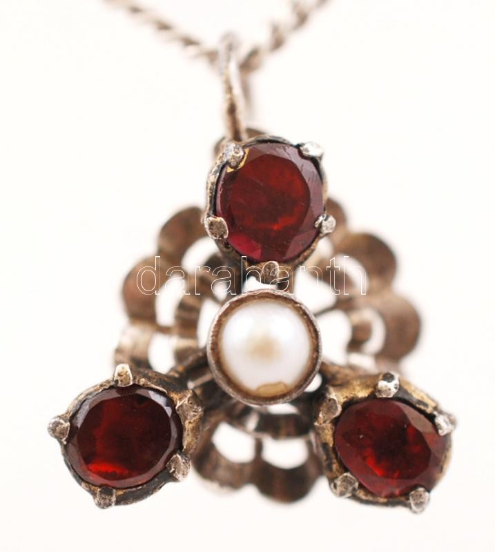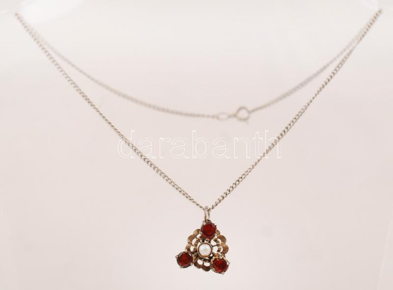 Ezüst (Ag.) lánc, csiszolt gránáttal és gyönggyel, bruttó: 6 g