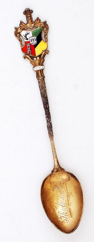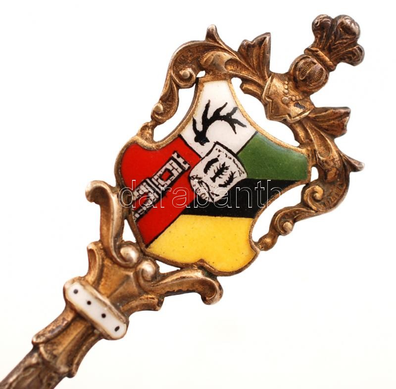 XIX. sz vége: Thale a. H. aranyozott ezüst kanál, zománcfestett képpel és címerrel / Vintage silver spoon. Thale a. H., Germany 11 g