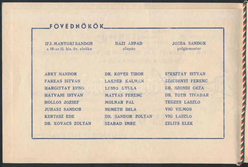 1948 Meghívó a Lánchíd újjáépítése javára rendezett pestszentlőrinci jubileumi 48-as bálra, a fővédnökök, védnökök és rendezők névsorával
