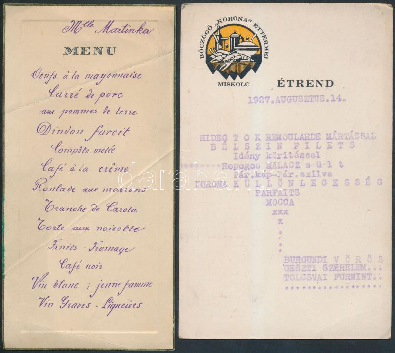 cca 1920 2 db menükártya, kézzel írt, ill. gépelt, magyar és francia nyelven, az egyik a Böczögő József-féle miskolci Korona szállodából