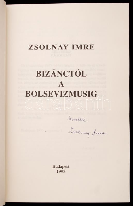 Zsolnay Imre: Bizánctól a bolsevizmusig. Bp., 1993, magánkiadás. 219 p. Kissé dohos kiadói papírkötésben. Dedikált példány!