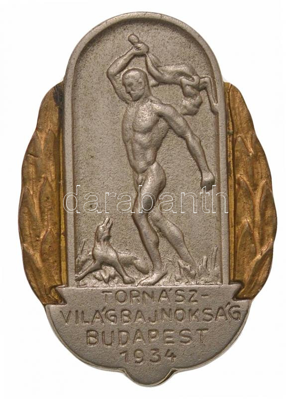 1934. "Tornász Világbajnokság Budapest" fém jelvény "Cserkészbolt V. N Sándor u.6." gyártói jelzéssel (30x21mm) T:2