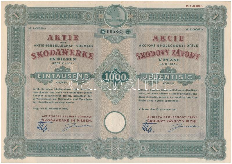 Description: Német 3. Birodalom / Cseh-Morva Protektorátus / Prága 1941. "Egykori Pilseni Skoda Művek Részvénytársaság" részvénye 1000K-ról szelvényekkel T:II-