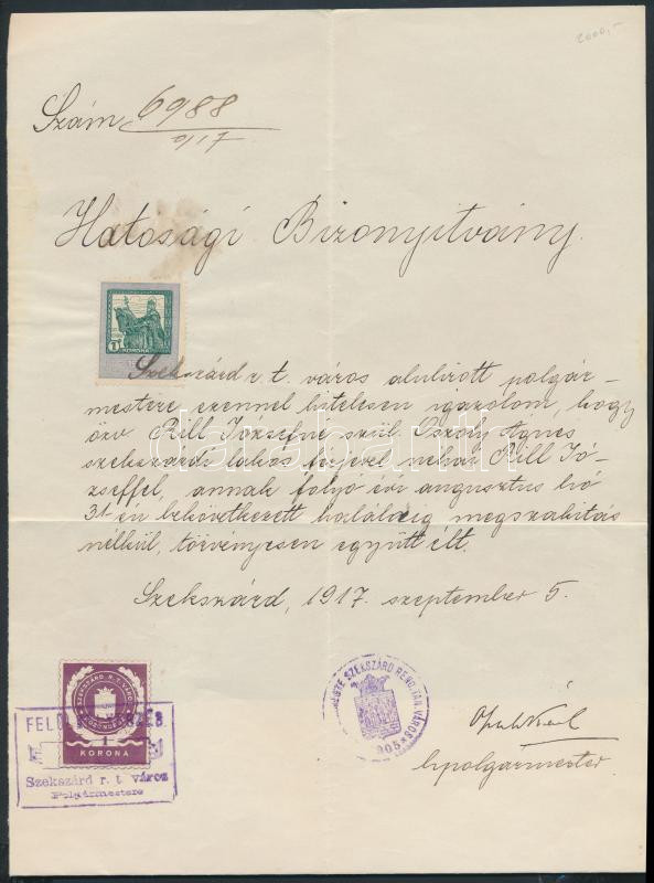 1917 Szekszárd városi 1K illetékbélyeg okmányon
