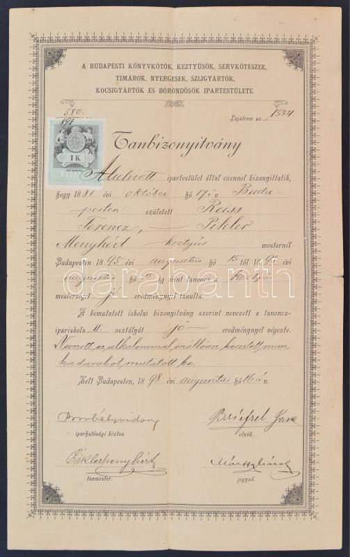 Description: 1898 A "Budapesti Könyvkötők, Keztyűsök, Sérvkötészek, Timárok, Nyergesek, Szíjgyártók, Kocsigyártók és Bőröndösök Ipartestülete által kiadott tanbizonyítvány 1K okmánybélyeggel