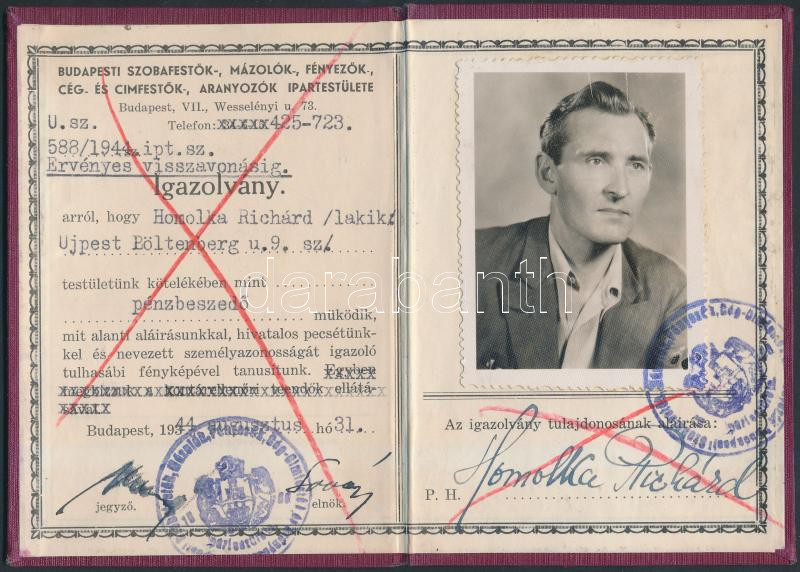 1944 Igazolvány, Budapesti szobafestők-, Mázolók-, fényezők,- Cég- és ...