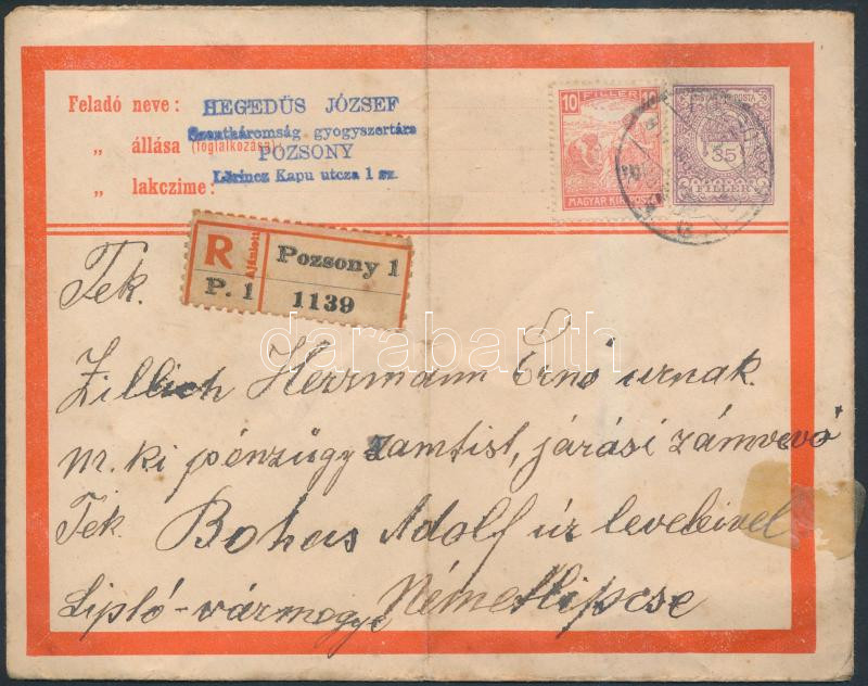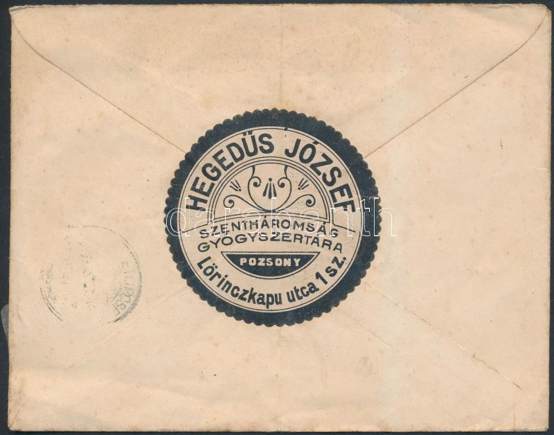 1914(?) Liptó vármegyei számvevő tisztnek küldött boríték, Hegedűs József gyógyszerésztől (Szentháromság gyógyszertár, Pozsony), levélzáróval