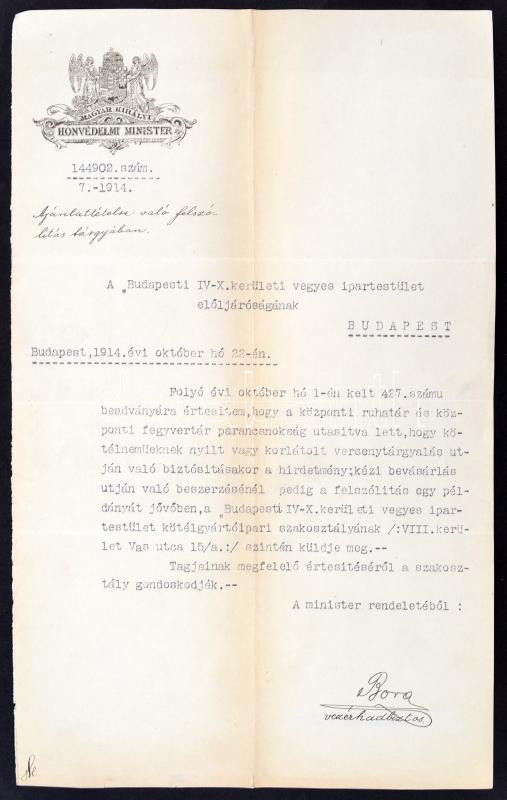 1914 Magyar Királyi Honvédelmi Minister hivatalos levele, 34x21cm
