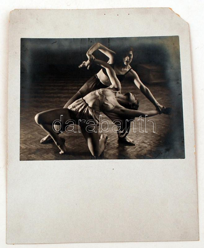 Description: 1932 Marsowszky Elemérné (Fotó Ada) feliratozott vintage felvétele Szentpál Olga tánccsoportjának két tagjáról (Bokor Kata és Dusi), kartonra ragasztva, 16x21 cm, karton (sarka hiányzik) 30x24 cm