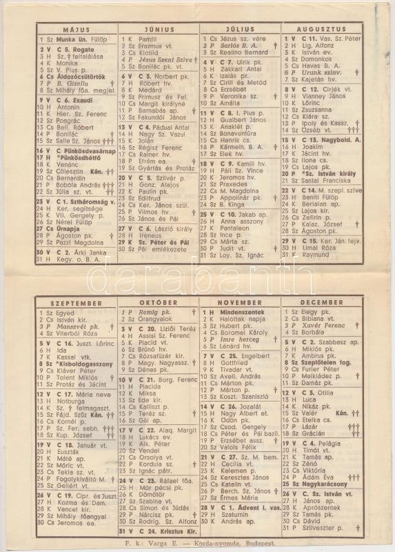 1948 Bp.VIII., A Korda R.T. kihajtható katolikus naptára