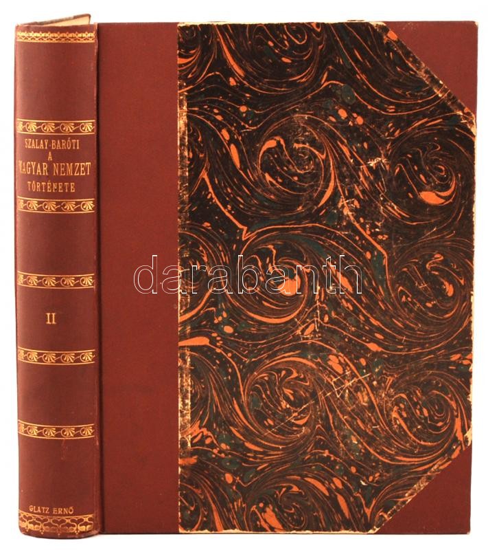 Szalay József-Baróti Lajos: A magyar nemzet története. I-IV. köt. Bp. 1895-1898, Lampel. Gazdag képanyaggal. Korabeli, aranyozott félvászonkötésben, változó állapotban. A könyvkötői félvászon a legtöbb esetben belül meglazult, elengedett, ezért nem tapad a könyvtesthez megfelelően. Két kötetnél a külső gerincvászon is felszakadt.