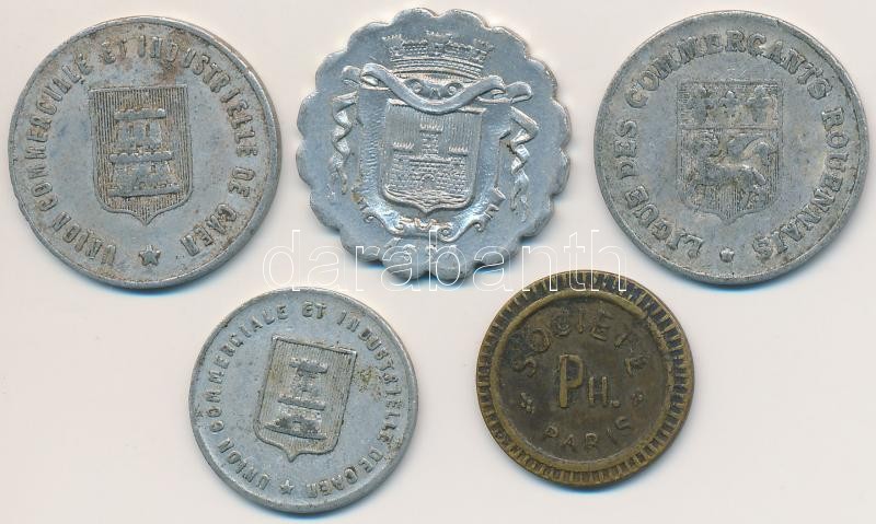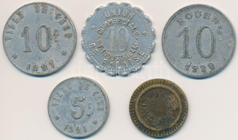 Description: Franciaország 1920-1921. 5db klf fém szükségpénz, közte Rouen, Caen, Falaise T:2,2-