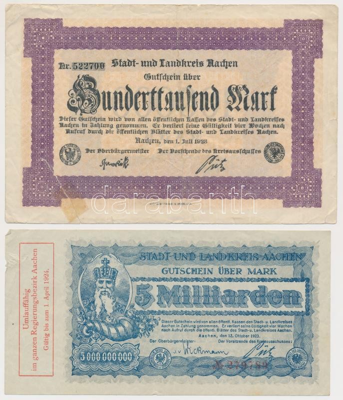 https://www.darabanth.com/en/257-Online-auction/257.0/Numismatics/Emergency-notes-and-coins-tokens~200006/Nemetorszag-Weimari-Koztarsasag-Ahlen-1918-5M-plus-Torgau-1922-100M-plus-Aachen-1923-100000M-~II1260056