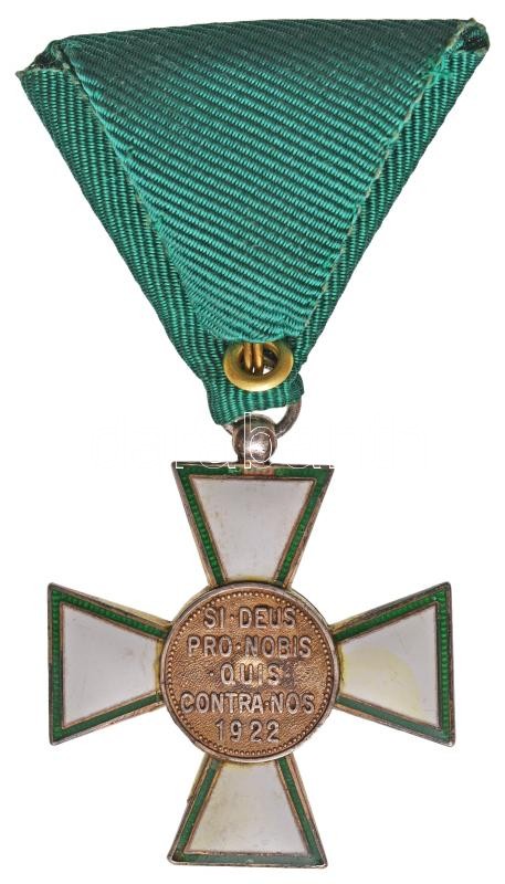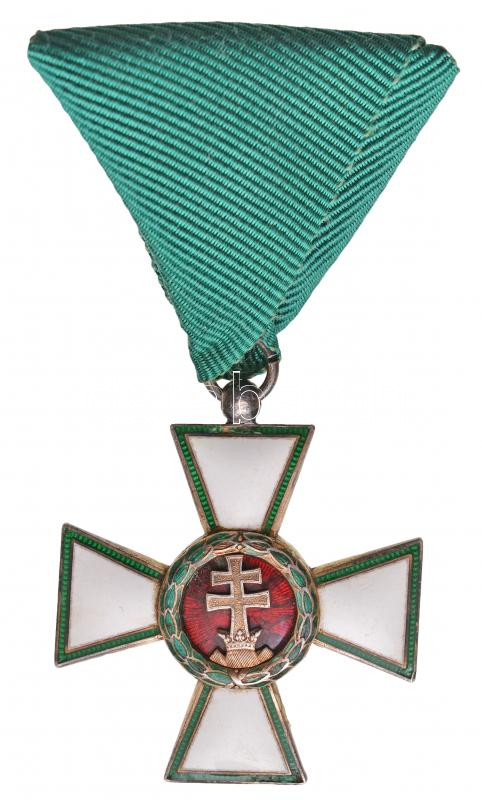 1935-1945. "A Magyar Érdemrend lovagkeresztje, késői típus" zománcozott Ag kitüntetés "BG" beütéssel, zöld mellszalagon, ragasztott elő- és hátlapi medalion! Nem eredeti tokban. T:2- zománchiba Hungary 1935-1945. "Hungarian Order of Merit, Knight's Cross, later type" enamelled Ag decoration with "BG" mark, on green ribbon, sticked obverse and reverse medallion! In not original case. C:VF enamel error NMK 380.