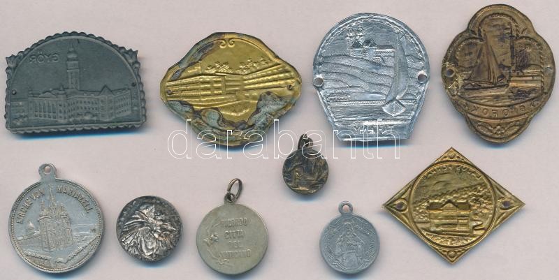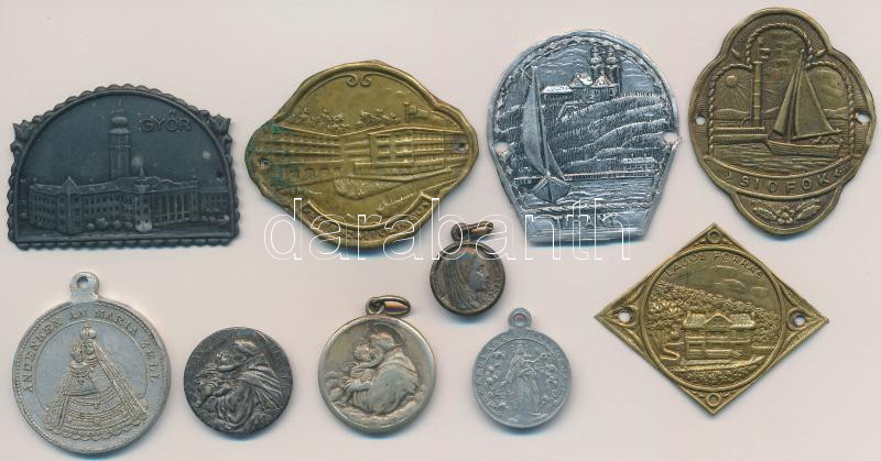 5db klf fém és Al kegyérem + 5db klf botjelvény: Lajos-forrás, Siófok, Győr, Tihany, Kékes Szálló T:2,2-