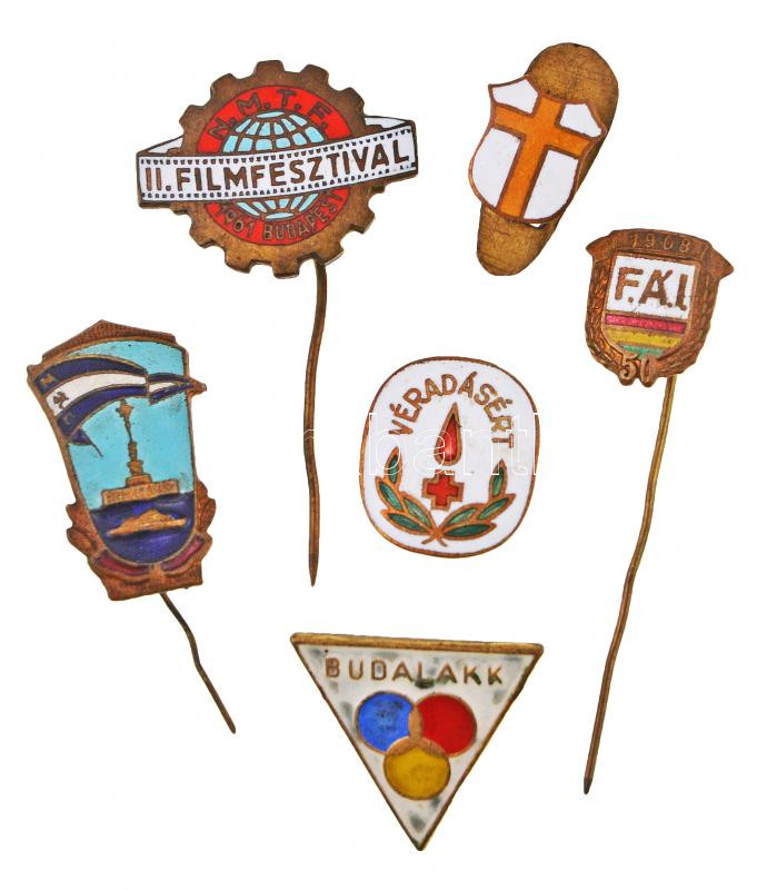 6db-os zománcozott jelvény tétel, benne "II. Filmfesztivál", "Budalakk", "Véradásért", "F.Á.I." T:2