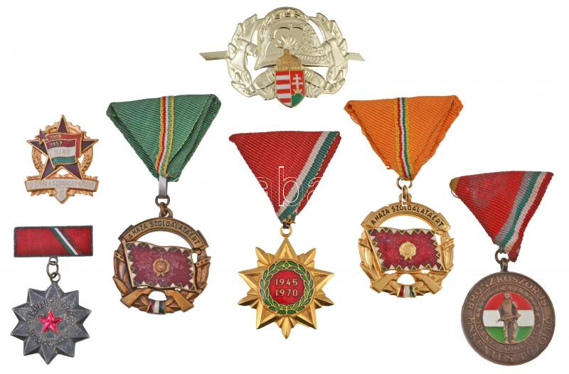 Description: 7db klf jelvény és kitüntetés, közte ~1960. "A Kisipari Szövetkezet Kiváló Dolgozója" fém kitüntetés, "A Haza Szolgálatáért arany fokozata" zománcozott aranyozott Br kitüntetés mellszalagon T:2
