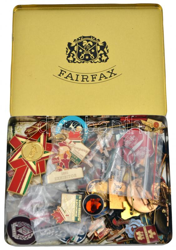 Description: Kis doboznyi vegyes jelvény tétel főleg a szocialista időszakból, benne több zománcozott T:vegyes