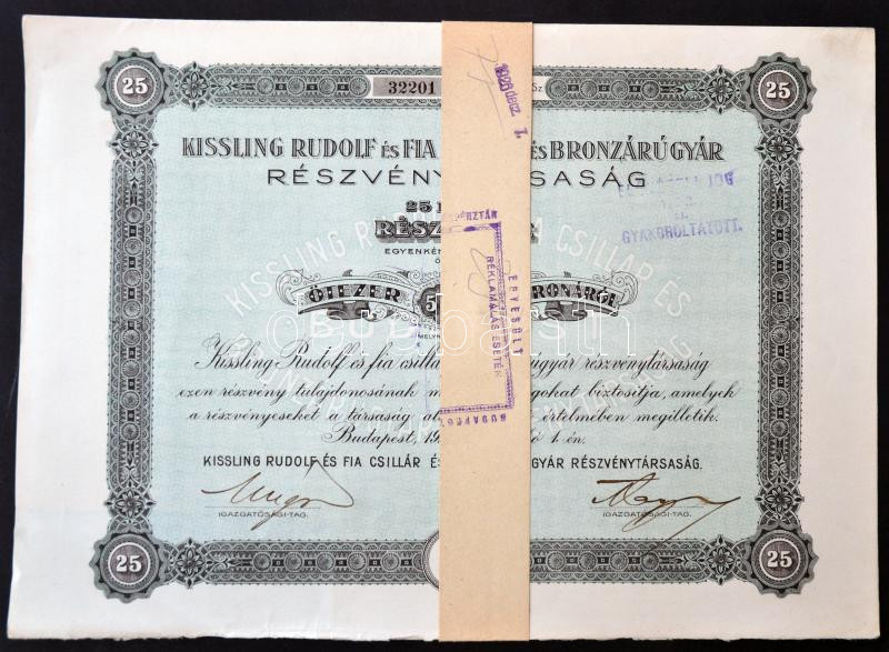 Budapest 1923. "Kissling Rudolf és Fia Csillár és Bronzárugyár Részvén... https://www.darabanth.com/en/257-Online-auction/257.0/Numismatics/Shares-and-Tickets~200005/Budapest-1923-Kissling-Rudolf-es-Fia-Csillar-es-Bronzarugyar-Reszvenytarsasag-25db-resz~II1260230