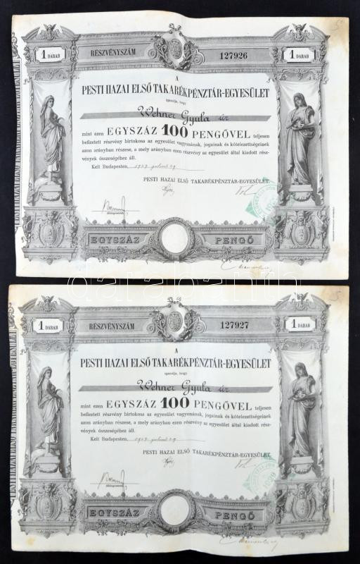 Budapest 1927. "Pesti Hazai Első Takarékpénztár-Egyesület" részvénye 1... https://www.darabanth.com/en/257-Online-auction/257.0/Numismatics/Shares-and-Tickets~200005/Budapest-1927-Pesti-Hazai-Elso-Takarekpenztar-Egyesulet-reszvenye-100P-rol-szelvenyekkel~II1260251