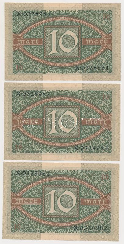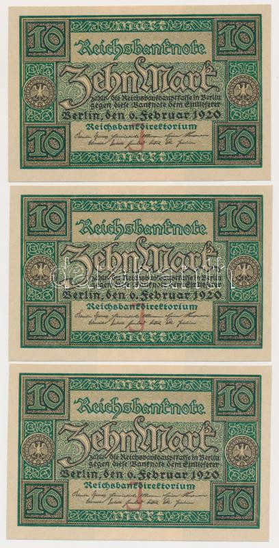 Germany / Weimar Republic 1920. 10 Mark (3x) sequential serials C:UNC