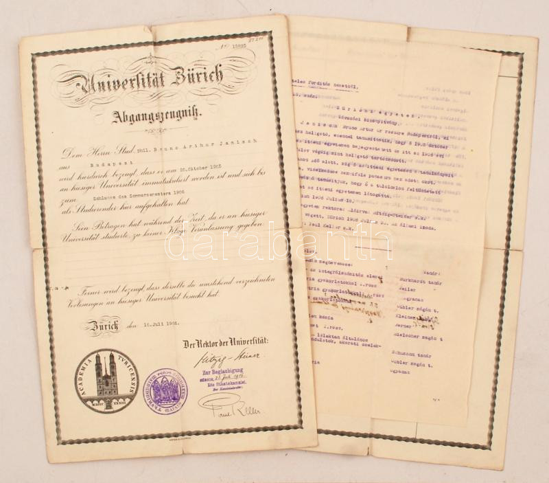1906 a Zürichi Egyetem távozási bizonyítványa magyar hallgató részére,... https://www.darabanth.com/en/257-Online-auction/257.0/Other-collectibles/Documents~16/1906-a-Zurichi-Egyetem-tavozasi-bizonyitvanya-magyar-hallgato-reszere-hitelesitett-magyar-~II1260895