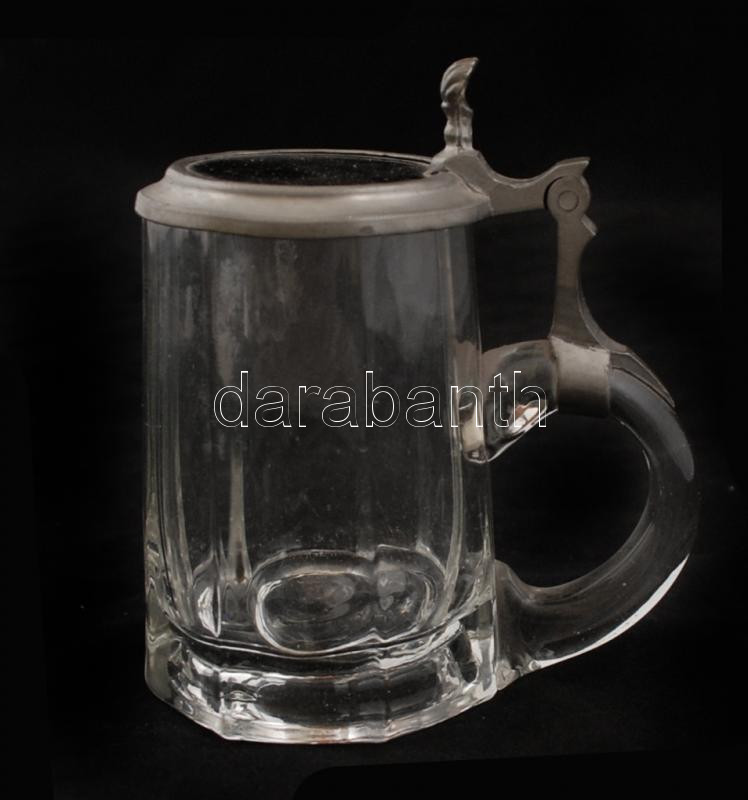 Kis korsó ón fedővel, mangán sárga üveg tetővel, m:11 cm