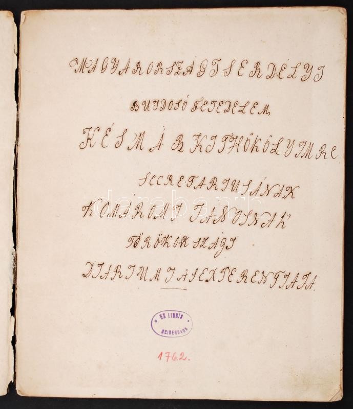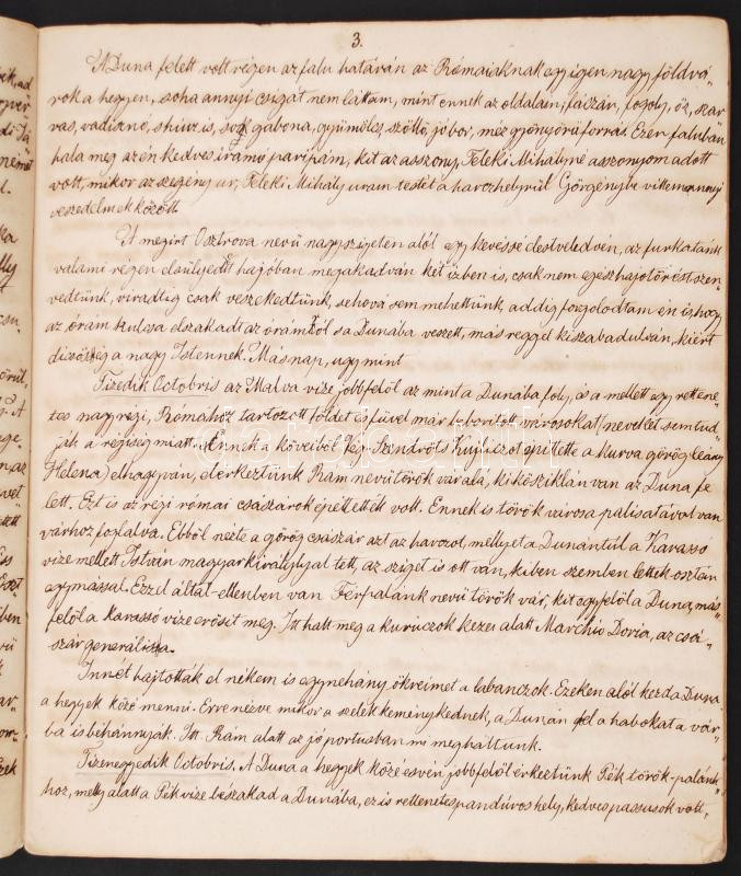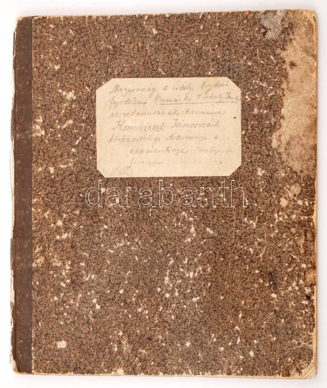 cca 1800-1860 Magyarországi és erdélyi bujdosó fejedelem késmárki Thököly Imre secretariusának Komáromi Jánosnak törökországi diariumja és experentiája(!). Komáromi János (?-1710) Teleki Mihály, majd Thököly Imre titkára és bizalmas embere törökországi naplója. Korábban ismeretlen, dobai Székely Sámuel (1704-1779) katonatiszt, könyvgyűjtő által készített átírásáról készült másolatban, apró eltérésekkel a Nagy Iván által 1861-ben és 1887-ben nyomtatásban közreadott (Pest, 1861 ill. Bp., 1887, Ráth Mór) változattól. Végig ugyanazon kéz munkája, több különböző tintával írva. Kopott papírkötésben, néhol foltos lapokkal, egyébként jó állapotban, 62 teleírt lap, összesen 65 p. / cca 1800-1860 Magyarországi és erdélyi bujdosó fejedelem késmárki Thököly Imre secretariusának Komáromi Jánosnak törökországi diariumja és experentiája(!). The diary of János Komáromi (?-1710) secretary of Mihály Teleki chancellor of Transylvania and Imre Thököly prince of Transylvania about the years in exile in the Ottoman Empire. In a previously unknown handwritten copy made after the transcription of the military officer and book collector Sámuel Székely of Doba (1704-1779), with slight differences from the variant published by Hungarian historian Imre Nagy in 1861 and 1887. The work of the same hand but with different inks. In a worn out paper binding, some pages are stained but otherwise in good condition, 62 pages written, 65 pages in total.
