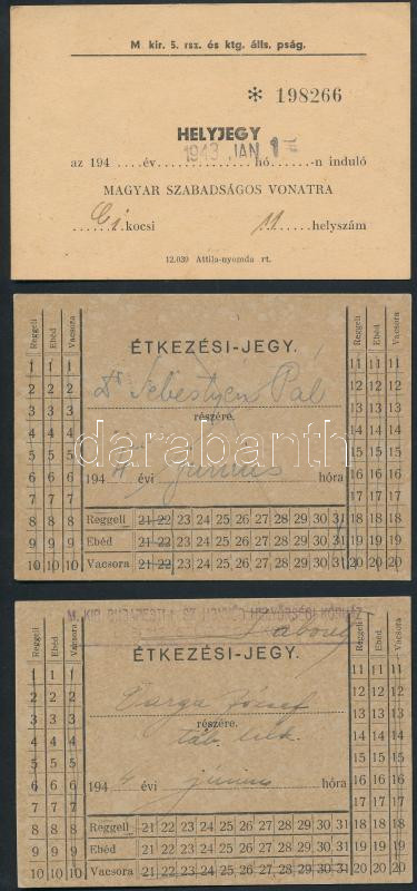 1943-44 Katonai étkezési-jegy, 2db, +helyjegy szabadságos vonatra, cca...