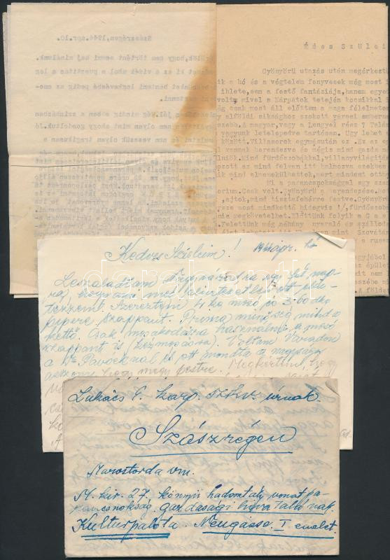 Description: Lukács Elemér karpaszományos őrmester levelei 1943-45 között lengyelországi és erdélyi eseményekről, fogságba esésről stb., érdekes katonai adalékokkal. cca 50 géppel és kézzel írt, közte több oldalas levéllel