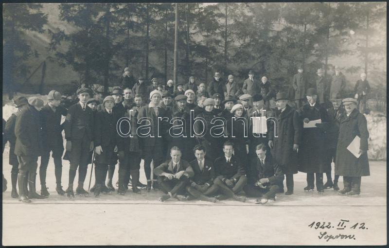1922. február 12. Sopron, Hoki mérkőzés után a játékosok, támogatók, versenybírák csoportképe, 9x14 cm