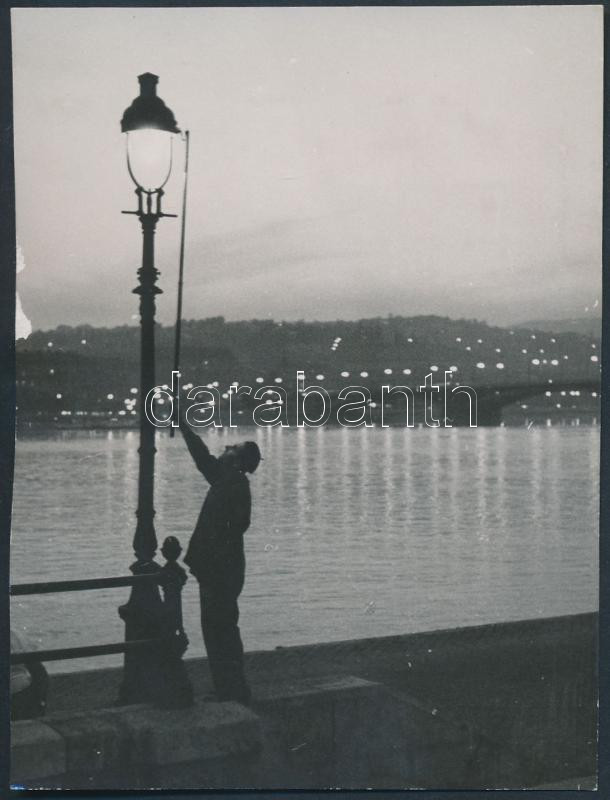 1963 Budapest, a Margit híd közelében begyújtják alkonyat után a gázlángot a Duna parti oszlopokon, feliratozott fotó, kis képszéli sérülés, 12x9 cm
