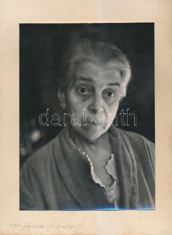 1966 Várnai Zseni (1890-1981) költő portréja, Koffán Károly (1909-1985) grafikus, fotográfus felvétele, hátul alírt vintage fotó, papírlapra felragasztva, 22x16 cm, hordozólap 28x21 cm