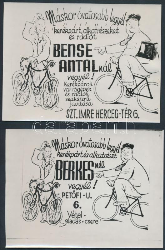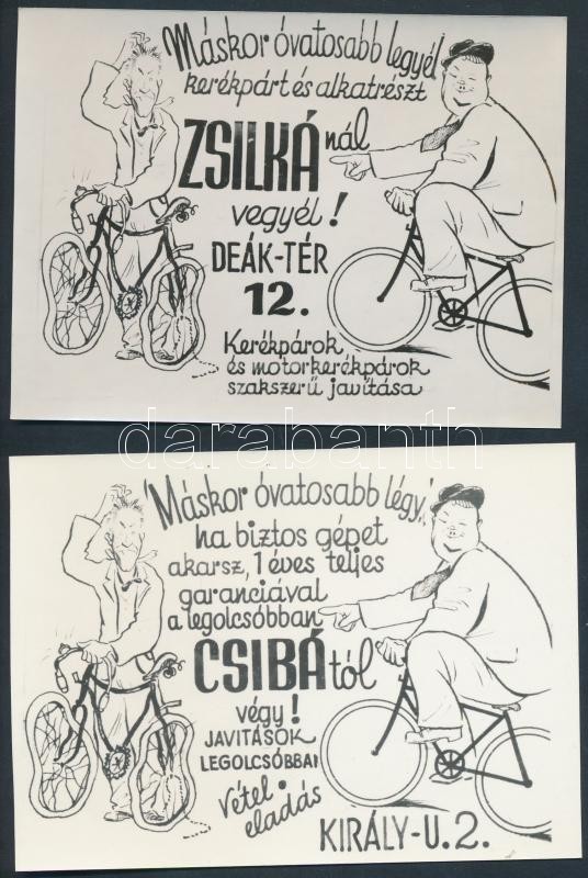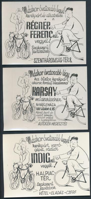 Description: cca 1940 Fekete György (1904-1990) budapesti fényképész specialitása a mozikban nagyfilmek előtt vetített álló diapozitív reklámképek voltak, ez az összeállítás kerékpár kereskedőkről, javítókról szólnak. A sorozat érdekessége, hogy változatlan grafikával és szlogennel 7 különféle budapesti megrendelőnek adta el, a diakészítéshez szükséges negatívokról készült későbbi nagyítások, 9x12 cm