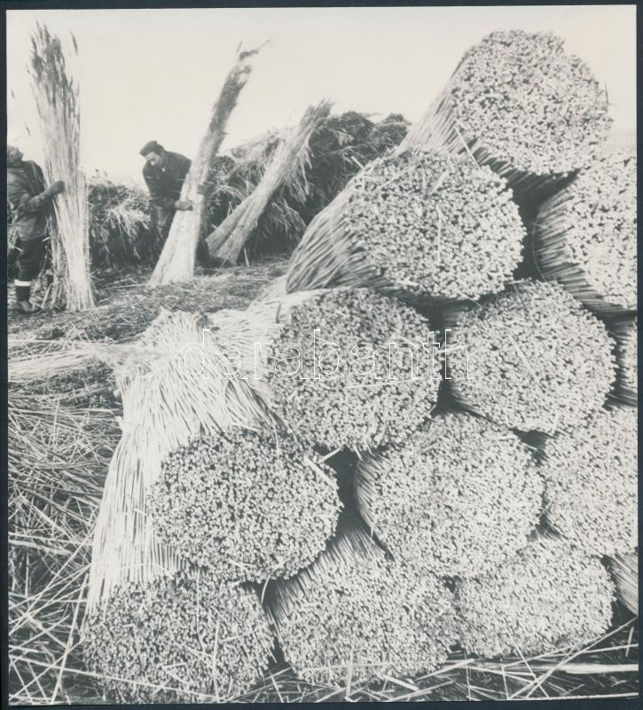 cca 1965 Velencei-tó, nádaratás után válogatják, osztályozzák, kévébe kötik a learatott termést, 20x19 cm