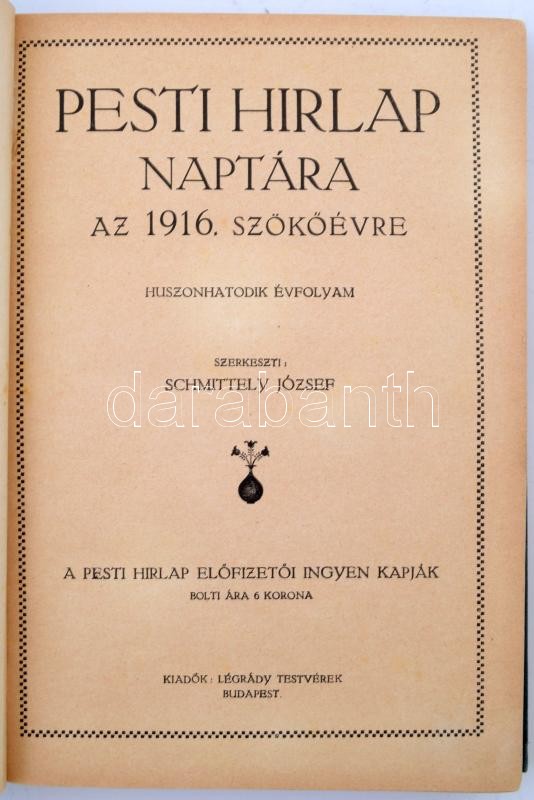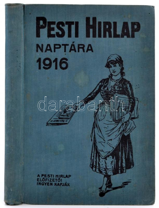 1916 A Pesti Hírlap naptára az 1916. szökőévre, 26. évfolyam, szerk. S... https://www.darabanth.com/en/257-Online-auction/257.0/Other-collectibles/Printed-Materials~28/1916-A-Pesti-Hirlap-naptara-az-1916-szokoevre-26-evfolyam-szerk-Schmittely-Jozsef-megje~II1260410
