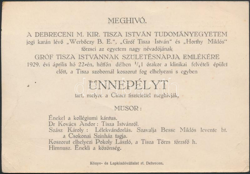 https://www.darabanth.com/en/257-Online-auction/257.0/Other-collectibles/Printed-Materials~28/1929-Debrecen-A-Verboczy-BE-Tisza-es-Horthy-torzse-altal-kiadott-meghivo-a-Grof-Tisza-~II1264307