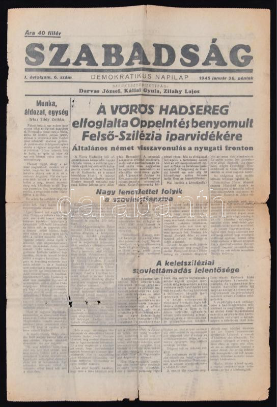 https://www.darabanth.com/en/257-Online-auction/257.0/Other-collectibles/Printed-Materials~28/1945-Szabadsag-Demokratikus-napilap-jan-26-i-szama-kis-hibakkal--pp4-46x31cm~II1260103