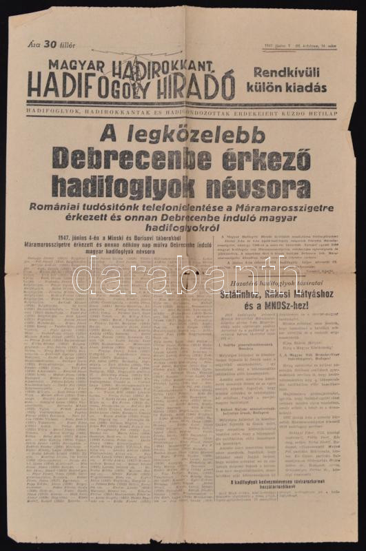 Description: 1947 Magyar Hadirokkant Hadifogoly Híradó, Hadifoglyok, hadirokkantak, és hadigondozottak érdekeiért küzdő hetilap. "A legközelebb Debrecenbe érkező hadifoglyok névsora". Kissé szakadozott, pp.:2, 47x31cm