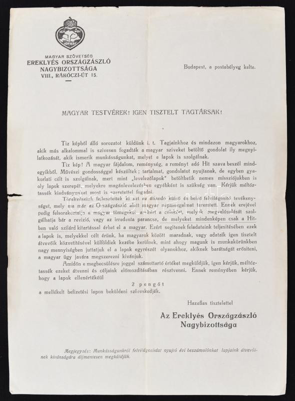 cca 1930 Magyar Szövetség Ereklyés Országzászló Nagybizottság levele, ...