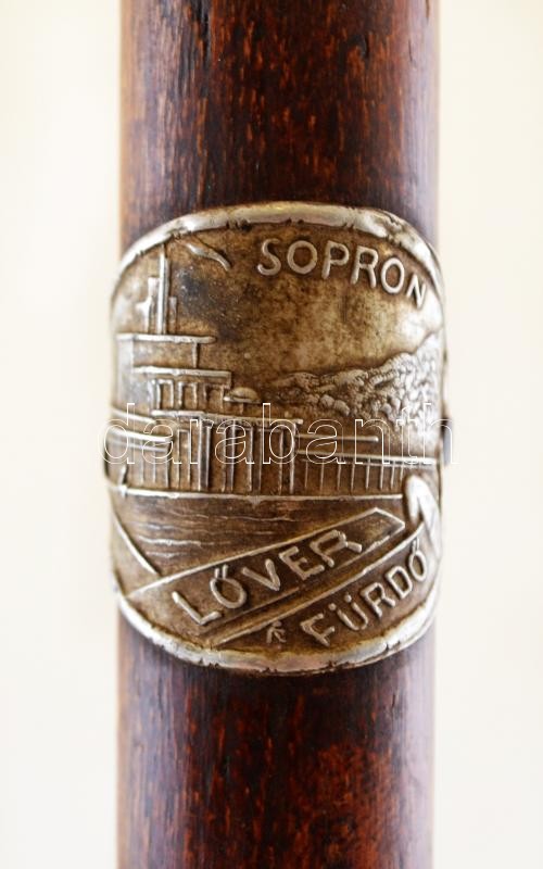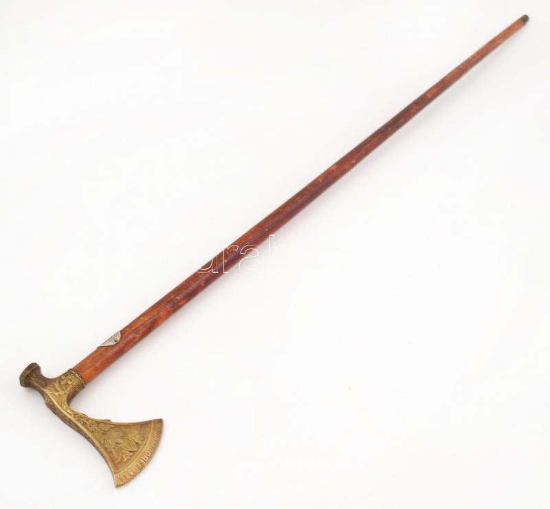 Dísz fokos, cserkészmotívumokkal gazdagon díszített réz fejjel, "IV. Jamboree 1933 Budapest-Gödöllő" felirattal, Sopron-Lővérfürdő botjelvénnyel, h: 91 cm