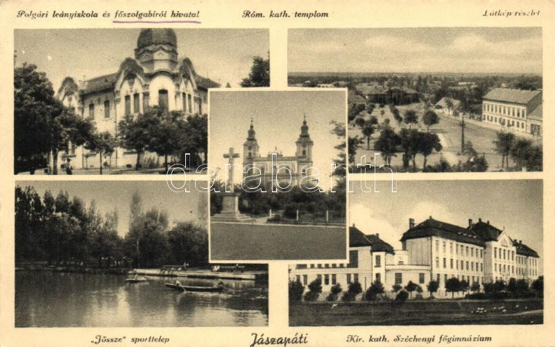 Jászapáti, Polgári leányiskola és főszolgabírói hivatal, 'Jössze' sporttelep, Széchenyi főgimnázium, Római Katolikus templom, kiadja Koczka Andor (EK)
