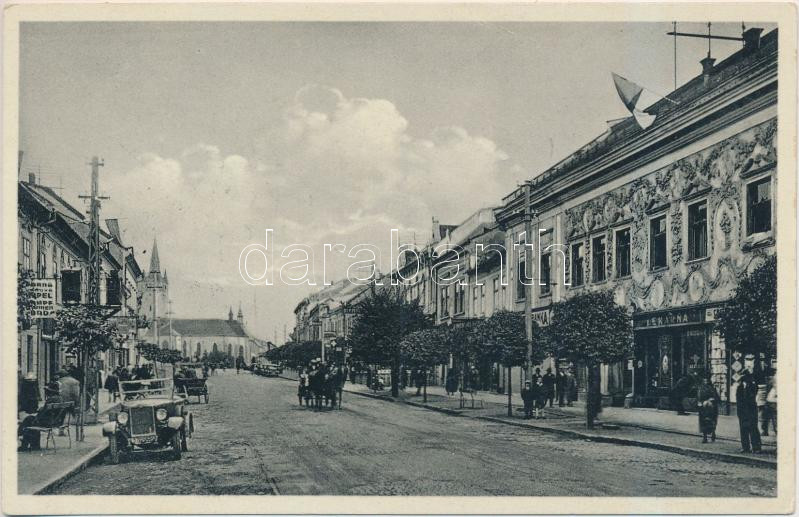 Eperjes, Presov; Masaryk utca, Lekarna üzlet, templom, automobil / street, shop, church, automobile