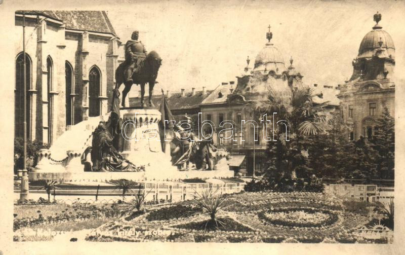 Kolozsvár, Cluj; Mátyás király szobra / statue, 'Kolozsvár visszatért'...