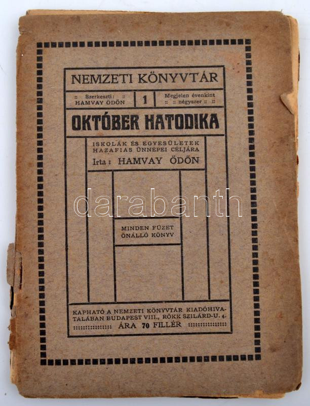 https://www.darabanth.com/en/258-Online-auction/258.0/Books/Books-History~29/Hamvay-Odon-Oktober-hatodika-Bp-1909-Nemzeti-Konyvtar-Kiadoi-gerincen-elszakadt-papir~II1268451