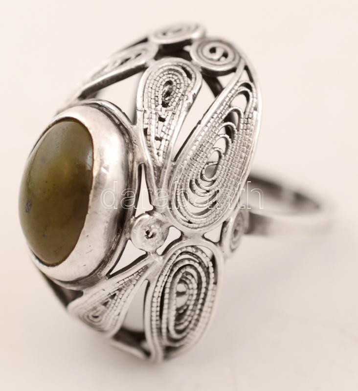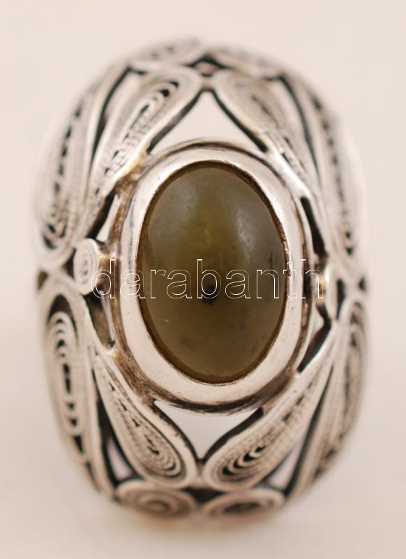 Zöld kővel díszített ezüst(Ag) gyűrű, filigrán díszítéssel, jelzett, ...