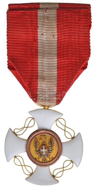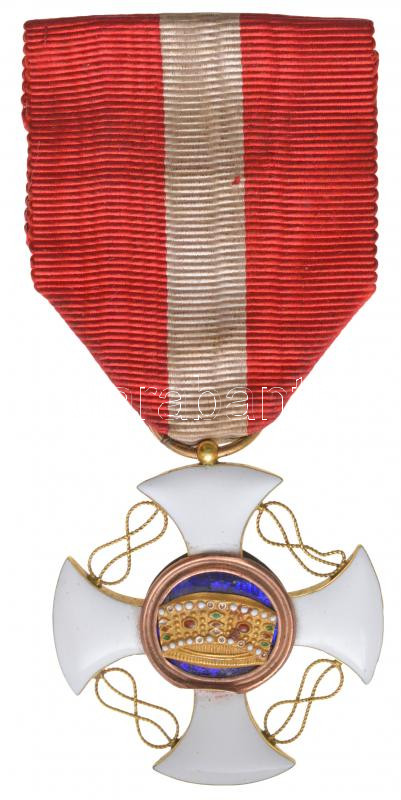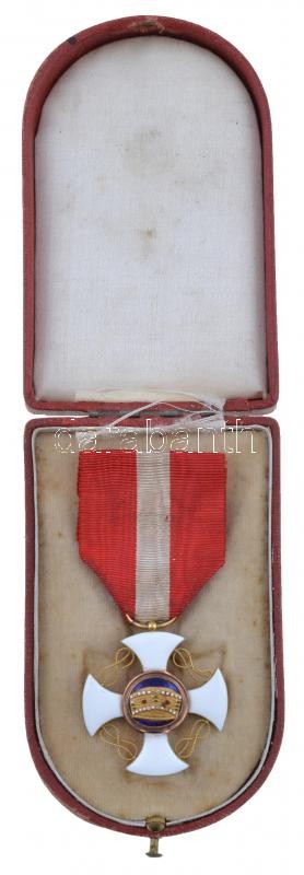 Olaszország 1868. "Olasz Korona Rend Lovagkeresztje" zománcozott, jelzetlen, részben arany kitüntetés mellszalagon, nem eredeti, a "A Német Lovagrend Mária Keresztje" kitüntetéshez tartozó tokban T:2- sérült medallion, az egyik hurok és a kereszt egyik szára hajlott Italy 1868. "Order of the Crown of Italy, knight" enamelled, partially gold decoration without hallmark, with ribbon, in the case of the "Marian Cross of the Teutonic Order" decoration C:VF damaged medallion, one knot and the bottom part of the cross is bent